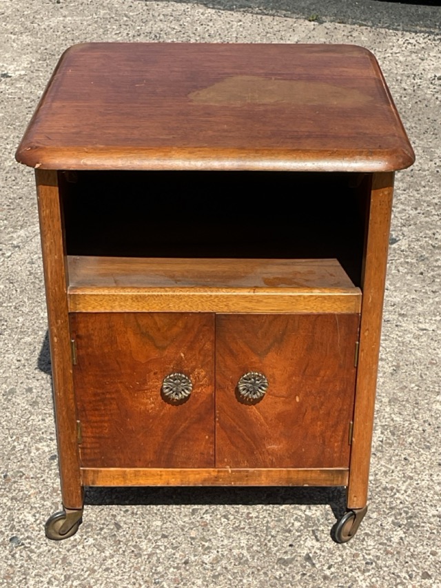 A 1950s walnut cabinet with square rounded top above an open compartment and cupboard with two doors, raised on casters. (20in x 20in x 24.75in)