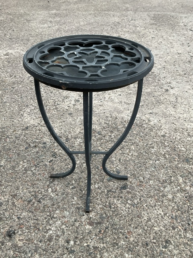 A square wrought iron plant stand with latticework panel to top on square supports with pad feet, having pierced decorative floral spandrels; and a circular stand with four waisted legs having pierced panel to top. (2)
