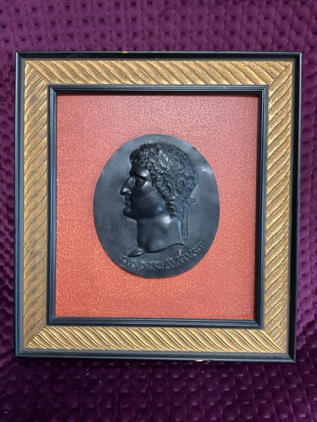 A pair of classical ebonised oval relief moulded plaques after the roman antique, Servius Galba and Augustus Divvas, mounted and in gilded gadrooned moulded frames. (11in x 12in) (2)