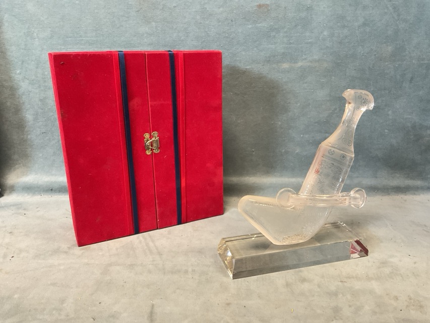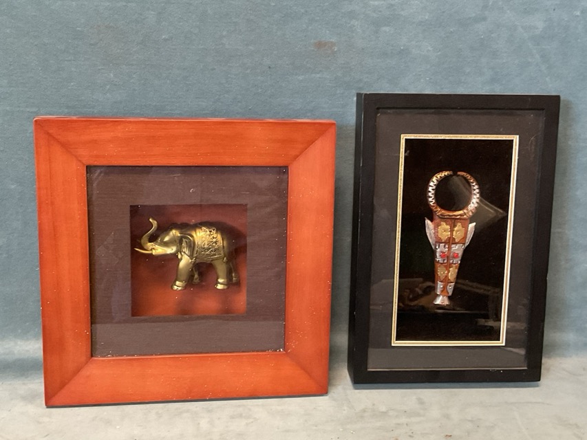 An Omani velvet cased military glass presentation trophy in the form of a traditional khanjar dagger; a box framed gilt figure of an Indian elephant; and a box framed miniature Cameroonian tribal mask. (3)