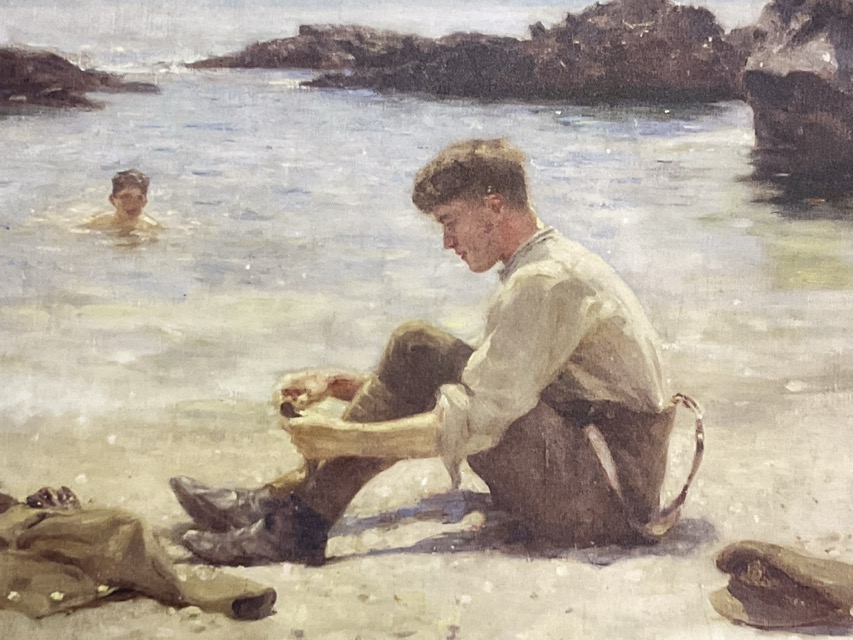 Judy Kyle, oil on canvas, Italian landscape with villa, titled Tuscan Retreat to verso, signed and gilt framed; and Henry Scott Tuke, coloured print, TE Lawrence as a cadet on Newporth Beach, signed in the print, and gilt framed. (2)