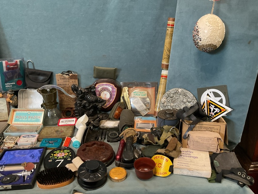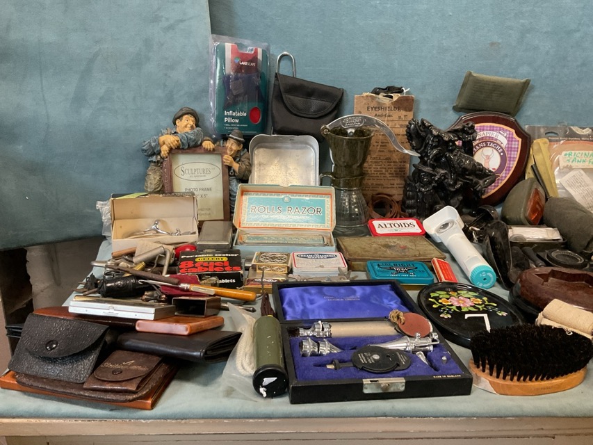 Miscellaneous collectors items including a military gas mask and filters, a compass, field dressings, etc., a cased medical ear scope and magnifying torch, a bakelite and glass cream maker, grooming items including hair clippers, razor strops, hairbrushes, a leather cigarette case, etc. (A lot)