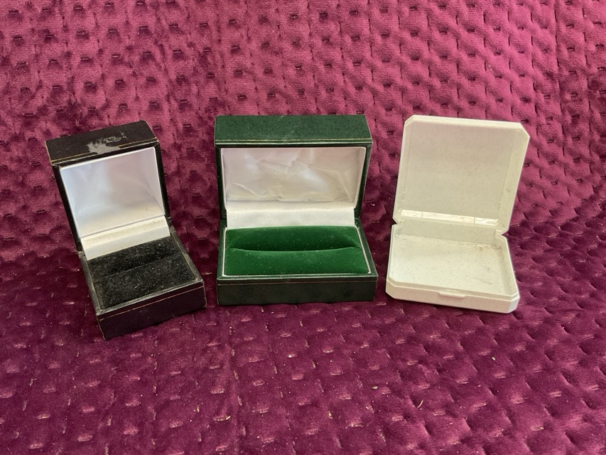 Nineteen black ring boxes, an earring box, a leather ring box, and a leather brooch box. (22)