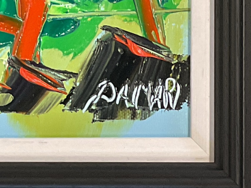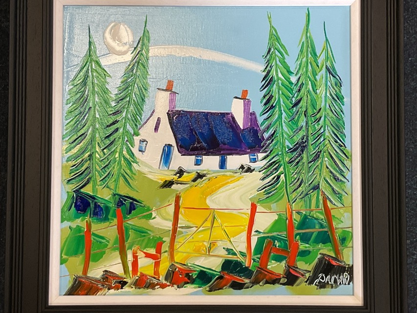 John Damari, oil on canvas, cottage amid pine trees, titled Mag’s Wee Croft Achnamara, Knapdale, Argyll to verso, signed and framed. (15in x 15in)