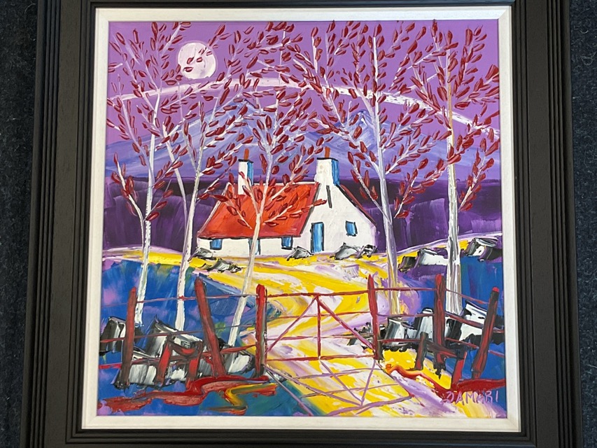 John Damari, oil on canvas, cottage with trees, titled Jock’s Red Roof Croft, Kintra, Isle of Mull to verso, signed and framed. (15in x 15in)