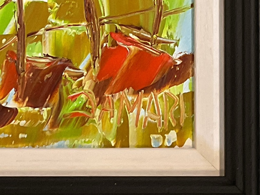 John Damari, oil on canvas, coastal scene with cottages and moored boat in a bay, titled Traigh Mhor Beach, Isle of Barra to verso, signed and framed. (15in x 15in)