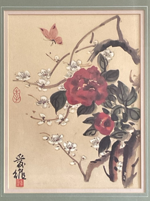 Chinese school, coloured prints, a set of three studies of flowering plants with butterflies, signed with characters in the prints, mounted, and in gilt faux bamboo frames. (8.75in x 12.5in) (3)