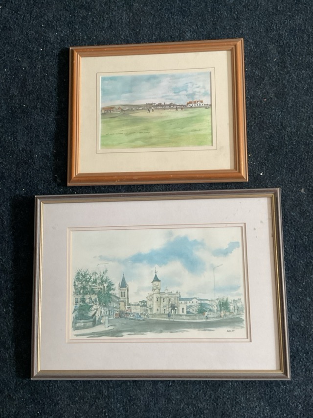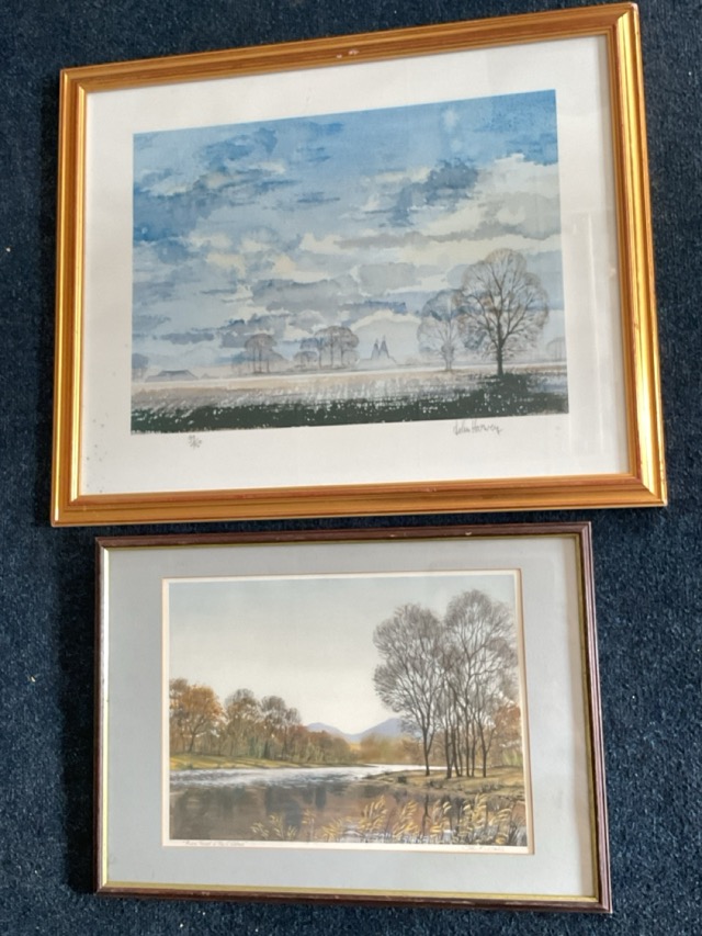 Four mounted framed coloured prints - John Harvey, landscape with oast houses, numbered and signed, John Martin, Tweed and the Eildons, titled and framed, J Walker, Dunbar golf course, and bell, view of Stockbridge Edinburgh. (4)