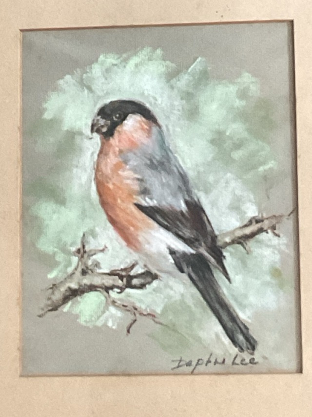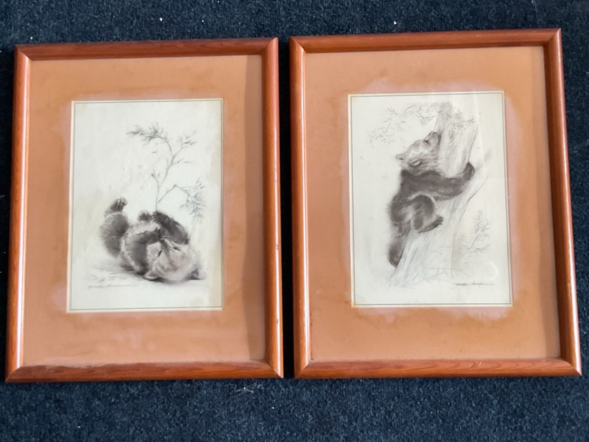 Daphne Lee, pastel, study of a bullfinch, signed - 6.5in x 8.25in; and R Thompson, a pair of prints of bear cubs, signed in the prints - 8.25in x 12.5in, each mounted and framed. (3)