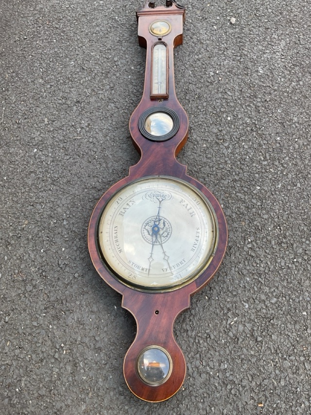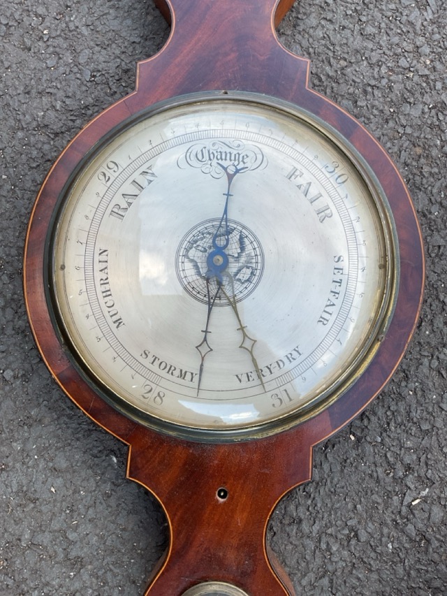 A nineteenth century mahogany boxwood strung barometer with swan-neck cornice above brass dry/damp dial, an arched silvered thermometer, a convex mirror in ribbed ebonised frame, a silvered dial under convex glass and a level tube. (42in)