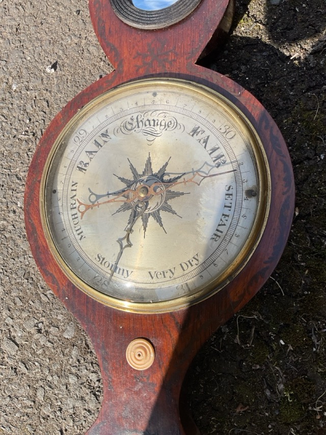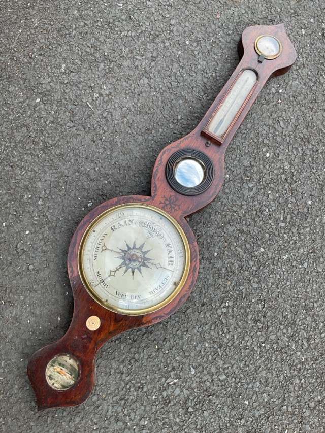 A nineteenth century lotus shaped rosewood barometer with painted scrolled decoration by D Fagioli of Warner Street London, having silvered dial under convex glass with brass bezel with subsidiary dials and convex mirror. (37in)