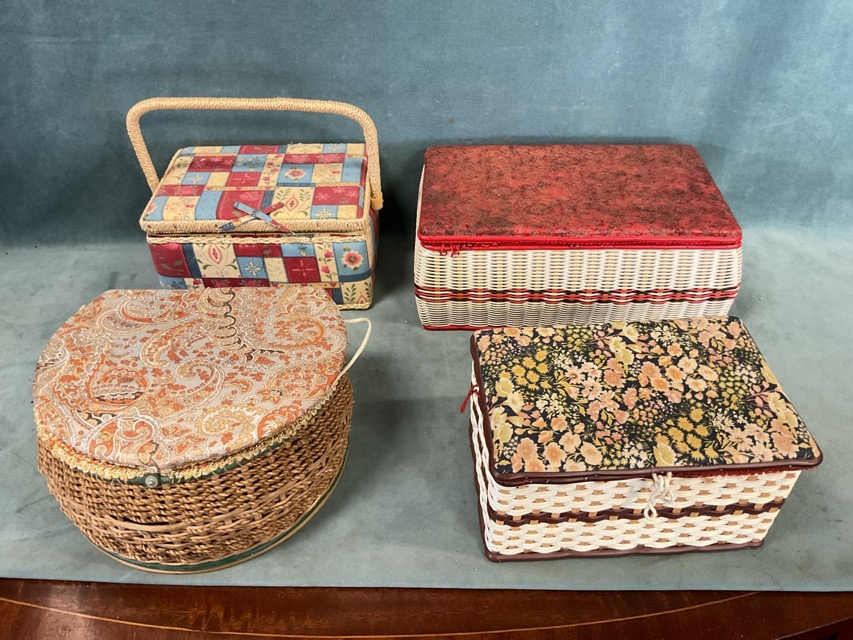 Four sewing baskets with contents including needles, pins, threads, yarns, trimmings, buttons, etc; a German Frister & Rossman Cub 7 electric tabletop sewing machine; and a British Vulcan Countess childs hand-cranked sewing machine. (6)