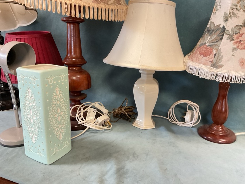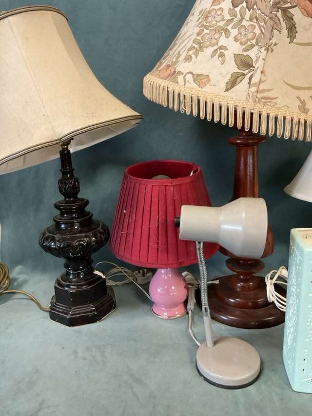 Seven miscellaneous tablelamps - large turned mahogany column, ceramic, a desk lamp, ebonised plaster, square fretwork lantern style, etc. (7)