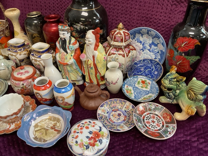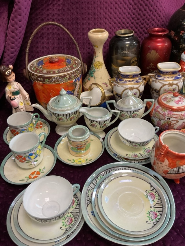 Miscellaneous oriental ceramics - vases, cups & saucers, bowls, a pair of Noritake floral gilt vases, part coffee sets, a sancai glazed stoneware lion, a pair of bearded immortal figurines, a Satsuma biscuit barrel & cover, a miniature redware teapot, etc. (A lot)