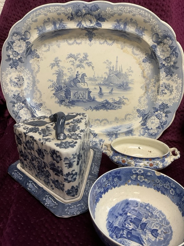 Miscellaneous Victorian blue & white - a giant stoneware meatplate with grecian statue decoration, willow ashets & bowls, a Wedgwood ferrara bowl, etc; and a repro triangular cheese dish & cover. (7)