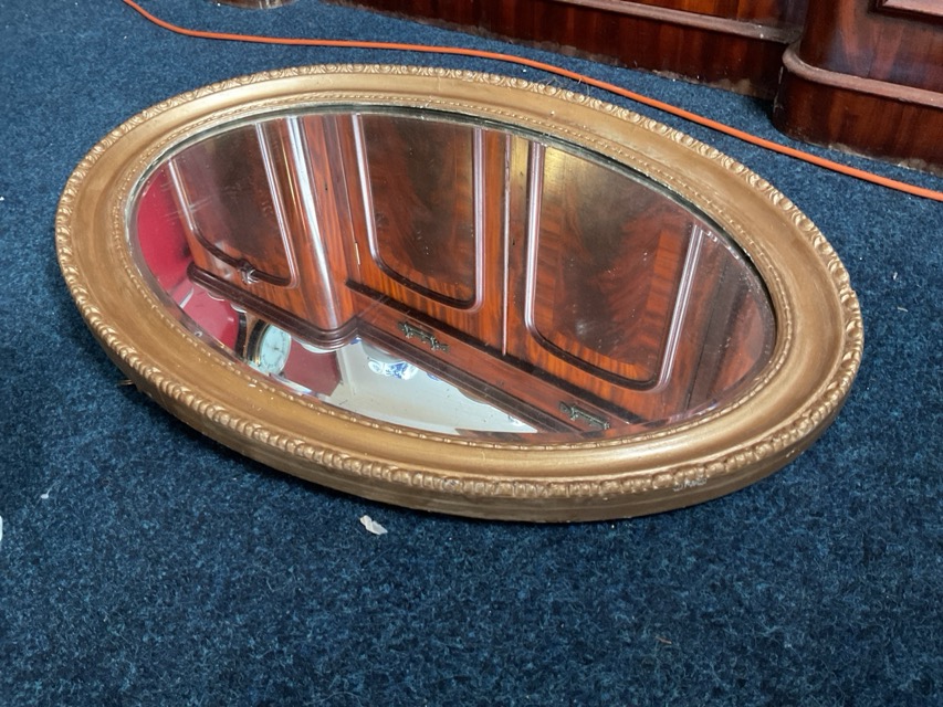 A late Victorian oval mirror with bevelled plate in gesso scrolled and lozenge beaded concave frame with later gilding. (34.5in x 24.25in ext)