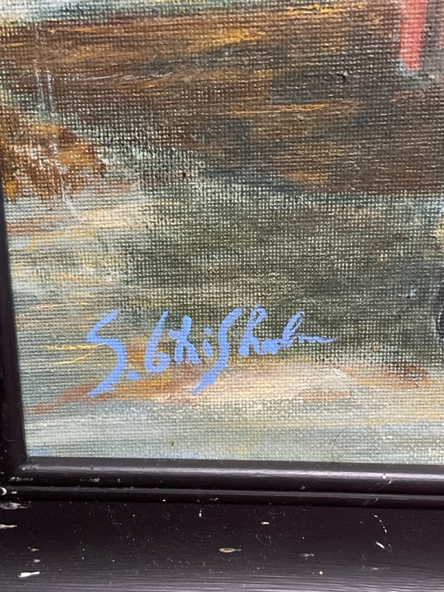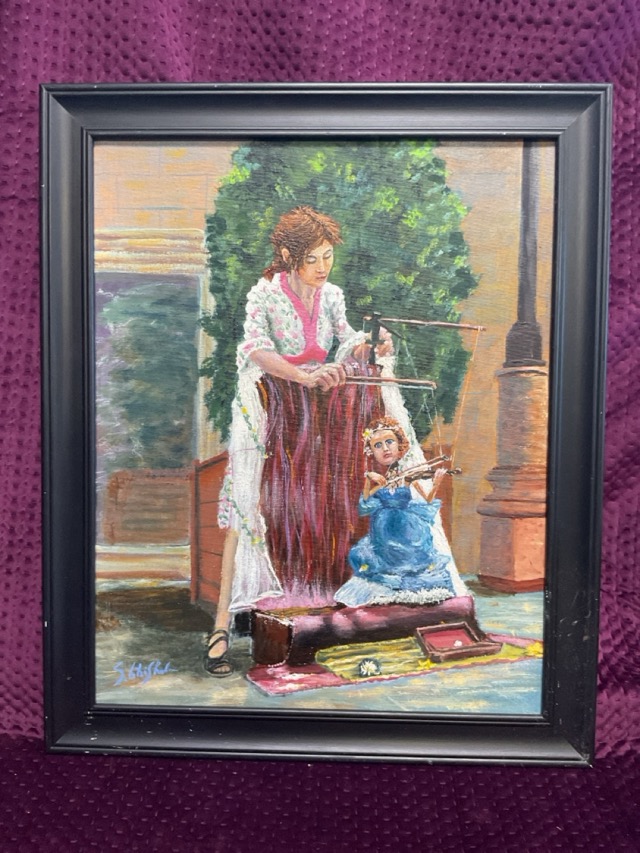 Steve Chisolm, oil on board, lady puppetier with marrionette, signed, labelled to verso Puppet Maestro of Cartagena, framed. (15.5in x 19.5in)
