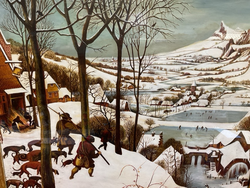Manuella Norris, watercolour, winter landscape scene after Pieter Bruegel the Elder, signed, in carved frame with gilt slip. (20.75in x 16.75in)