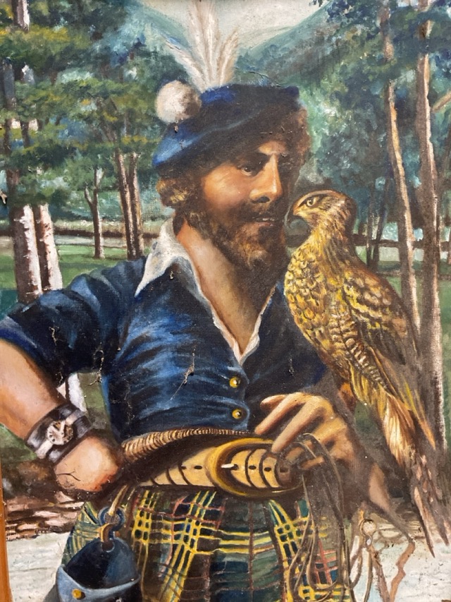 Manualla Norris, oil on board, study of a kilted falconer with bird, signed & framed; and an unframed oil by the same hand depicting pheasants, inscribed to verso Alness 1972. (2)