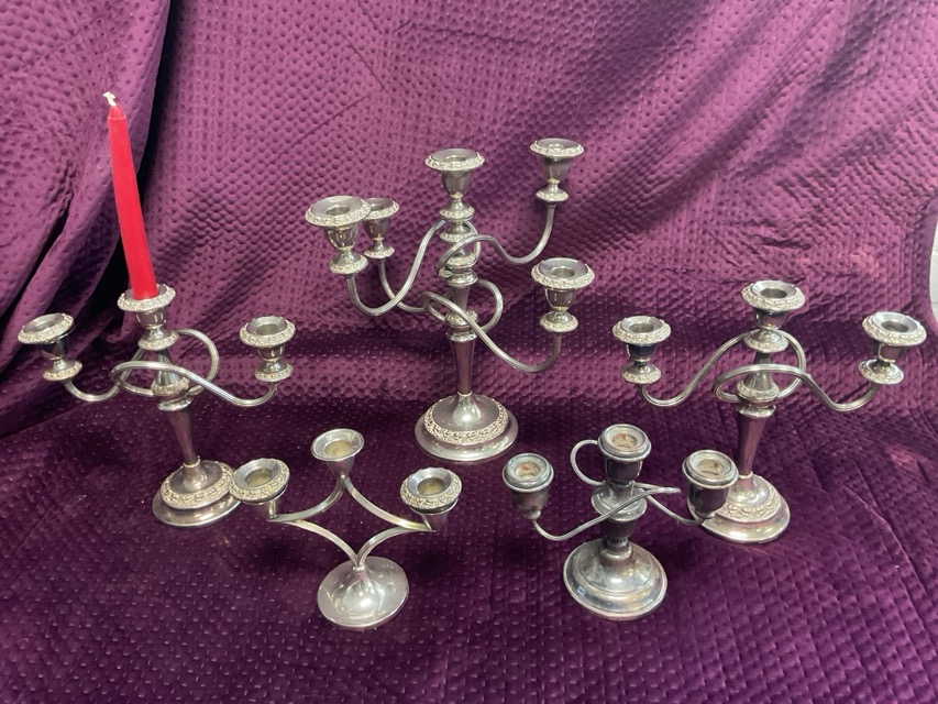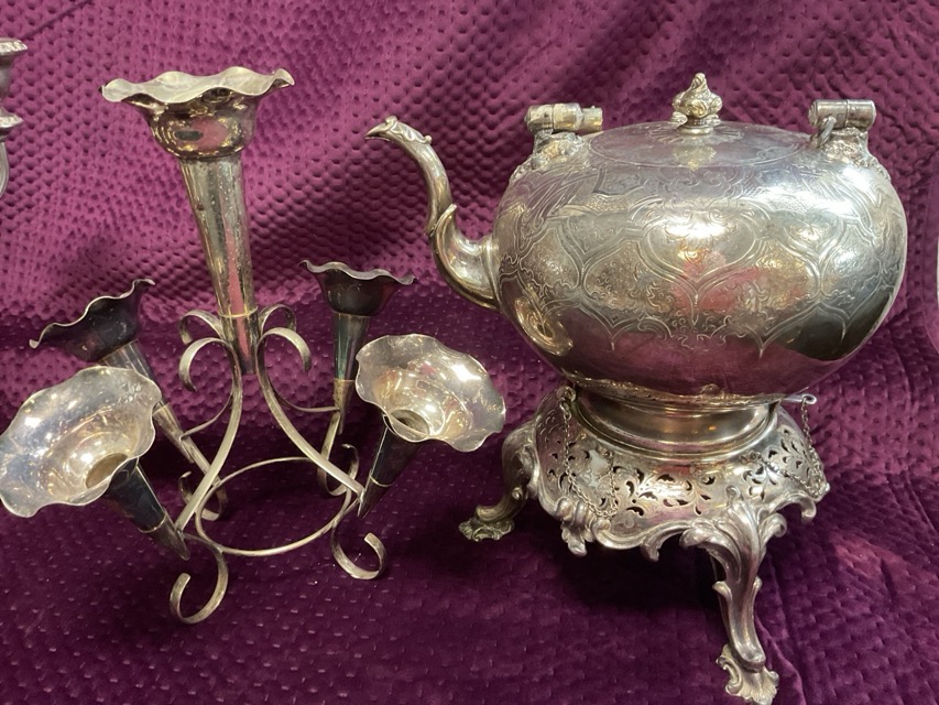 A set of three silver plated candelabra with reeded scrolled branches; a silver plated eperne with five trumpet shaped vases on scrolled stand; a large Victorian eastern engraved tea kettle on stand; and two other three branch candelabra. (7)