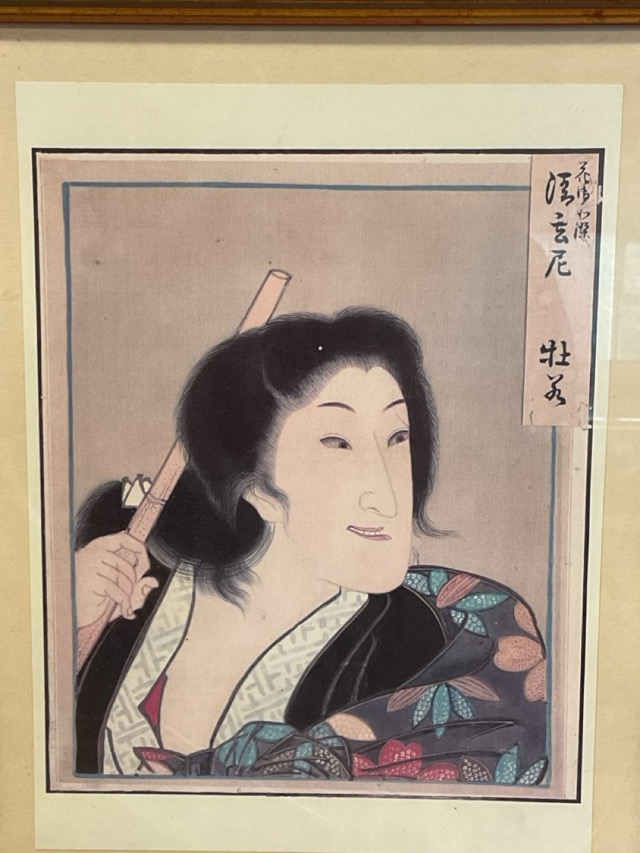 Five coloured prints after Japanese paintings by Shorakusai, depicting edo period actors in role, gilt framed. (8.75in x 12in) (5)