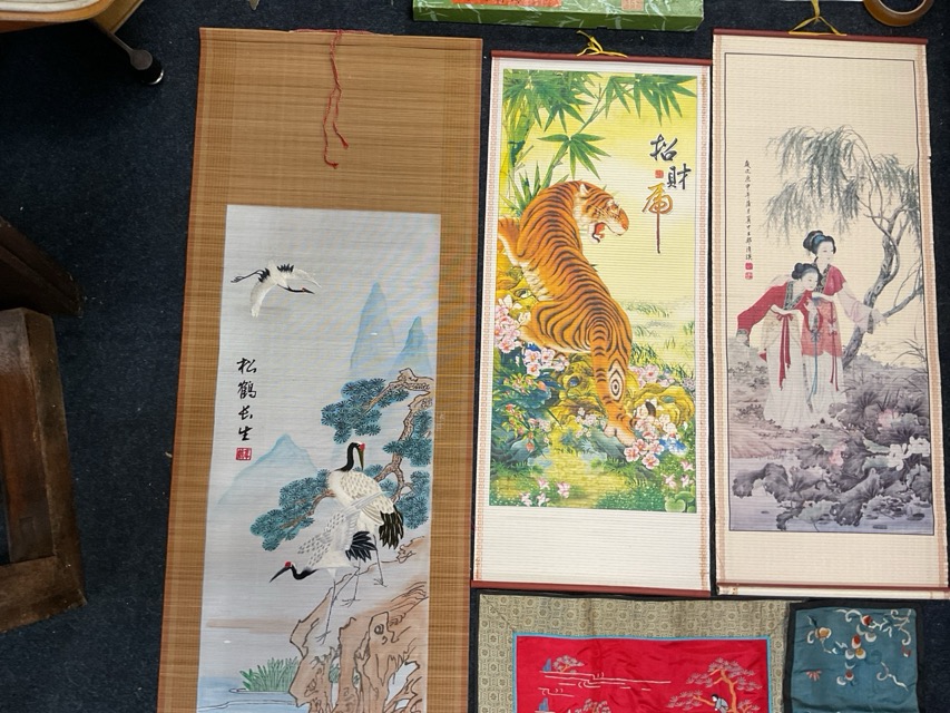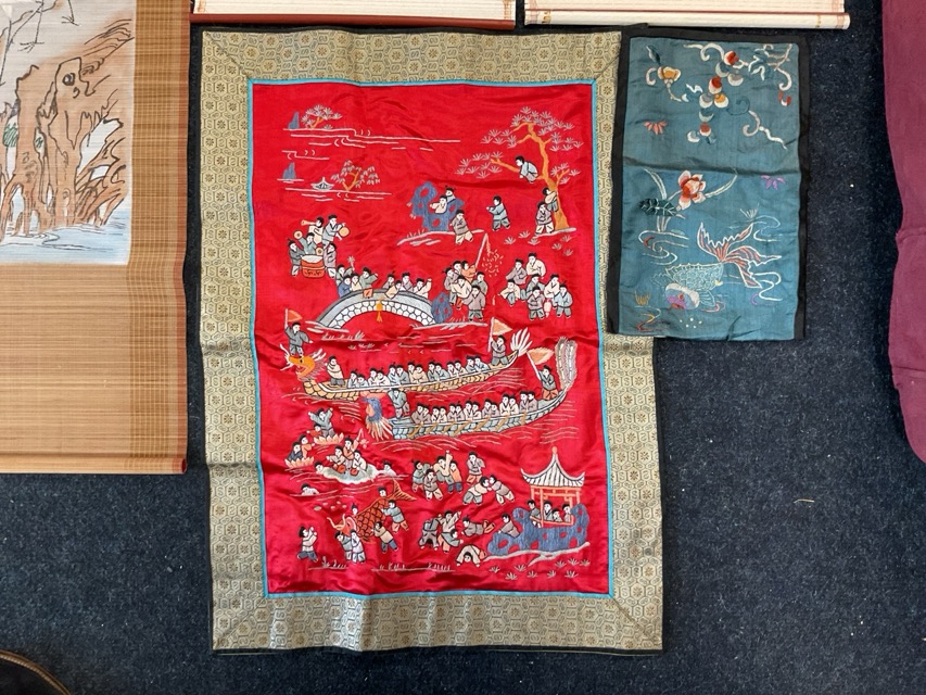 A Chinese painted & embroidered bamboo scroll; two printed paper scrolls; a Chinese embroidered silk pouch, decorated with fish; a textile panel depicting boats; and a print on silk depicting a temple. (6)