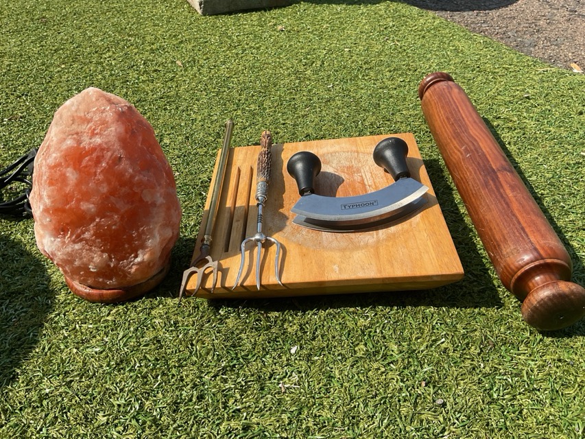 Miscellaneous items - a hardwood mezzaluna with twin steel blade; a heavy ironwood rolling pin; a telescopic brass toasting fork; a Victorian silver plated breadfork with carved horn handle; and a Himalayan rocksalt tablelamp. (5)