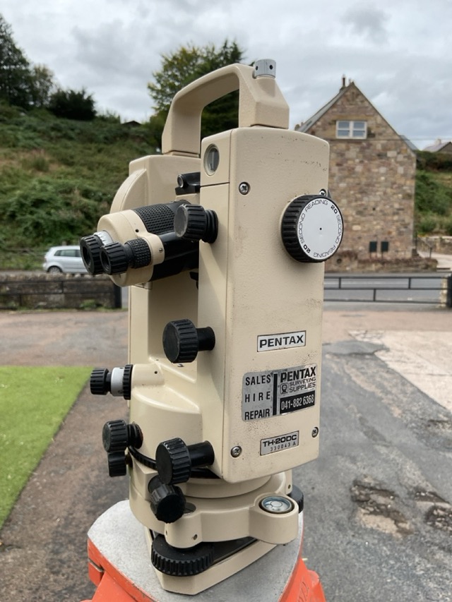 A cased Pentax TH-20DC digital theodolite, serial number 330043 A, with folding tripod stand. (2)
