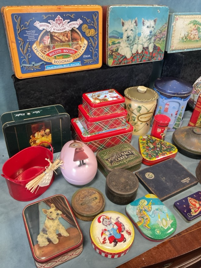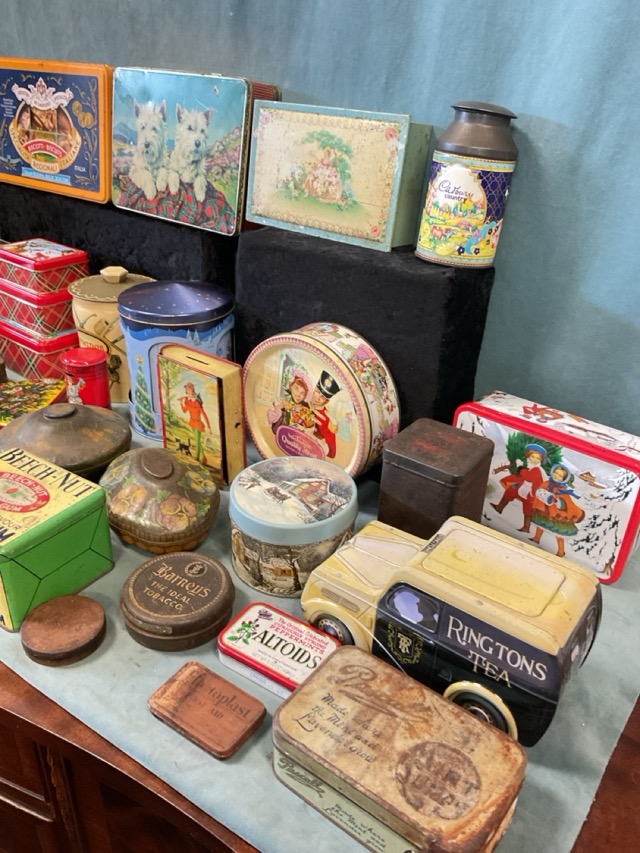 A collection of Edwardian and later tins - Royal Burgh oatcakes, Rowntree, Pascall, Edward Sharp, George Horner, Cadbury, Quality Street, Beech Nut chewing gum, Barney’s, Navy Cut, Thompson & Porteous, tobacco tins, biscuit tins, a Ringtons van, etc. (38)