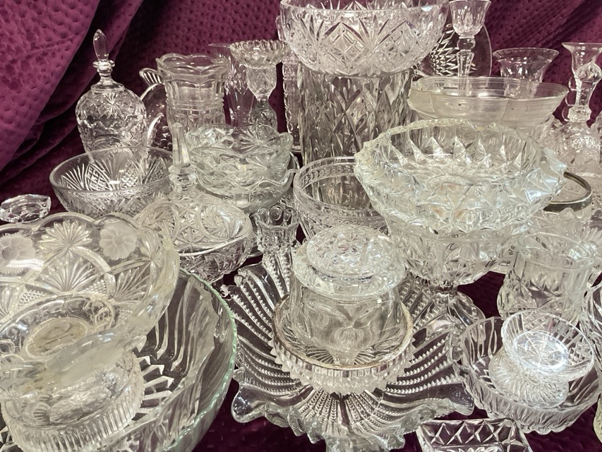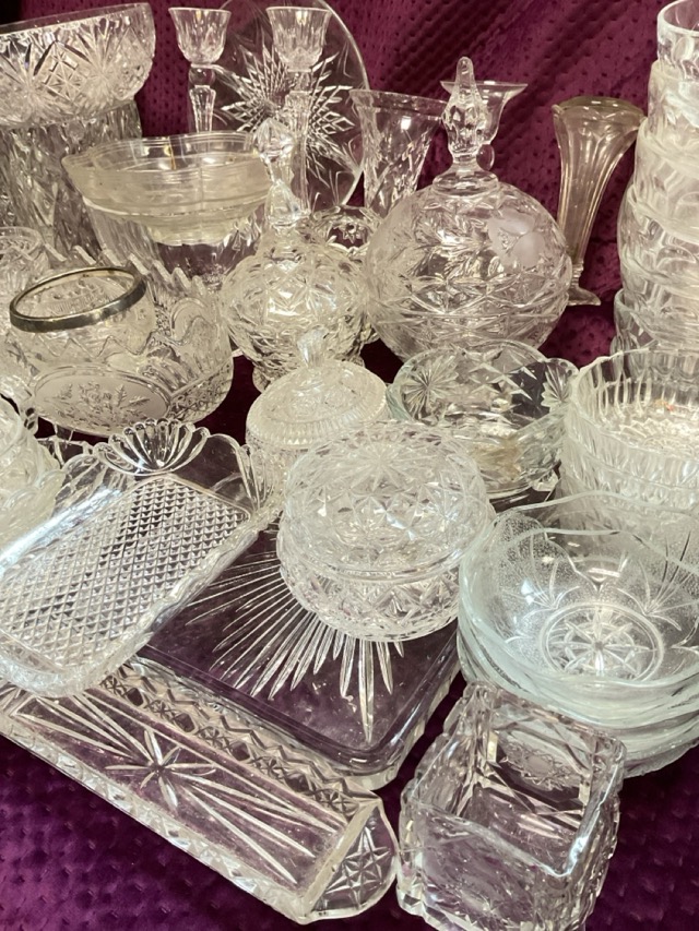 A large quantity of glass - bowls, vases, a pair of candlesticks, jugs, dressing table boxes, dessert sets, storage jars, trays, a fish dish, ashtrays, etc. (A lot)