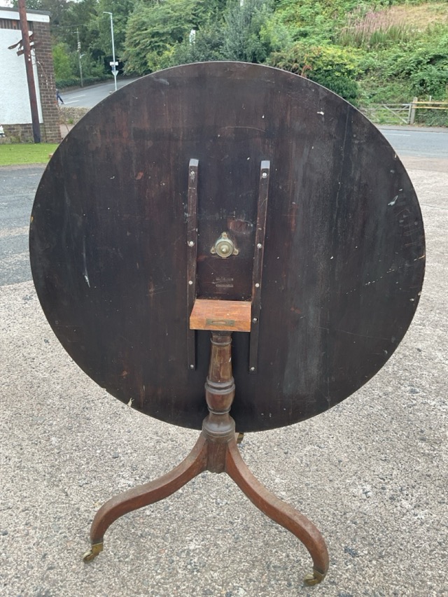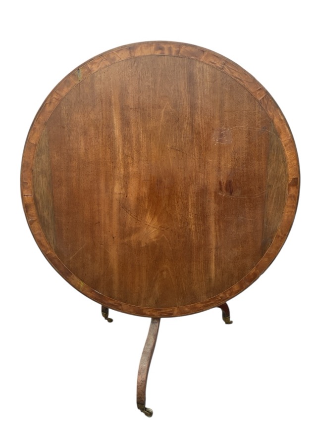 A regency boxwood strung satinwood banded mahogany breakfast table with circular top tilting on a turned column, raised on a tripod base with downswept legs on brass castors. (42in x 42in x 29.5in)