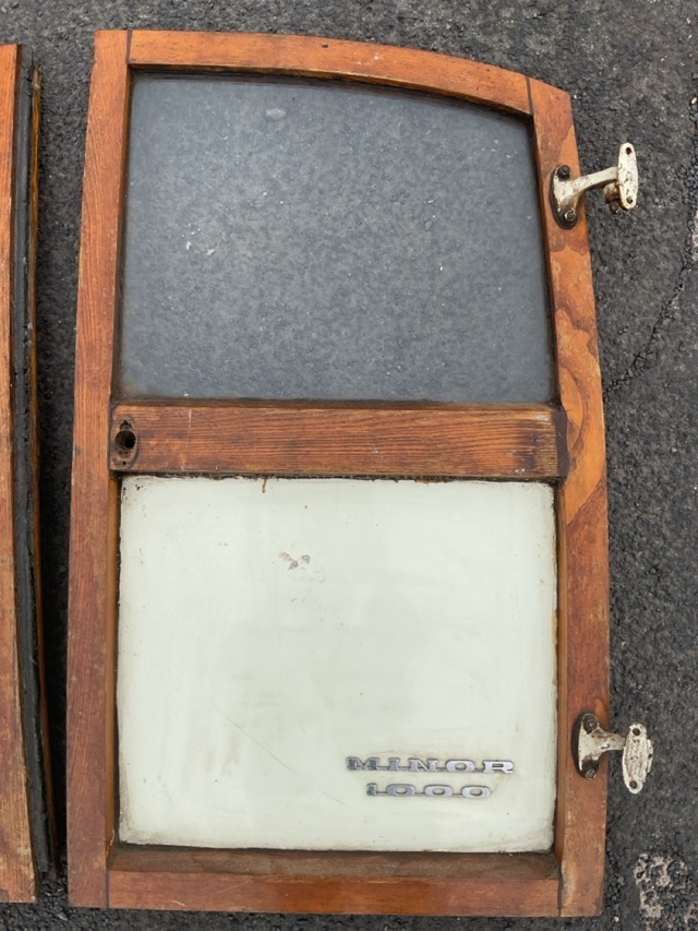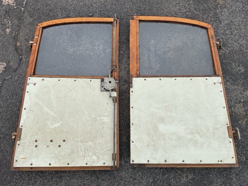 A pair of Morris 1000 traveller shaped back doors with oak frames and glazed & painted panels. (22.75in x 38.5in) (2)