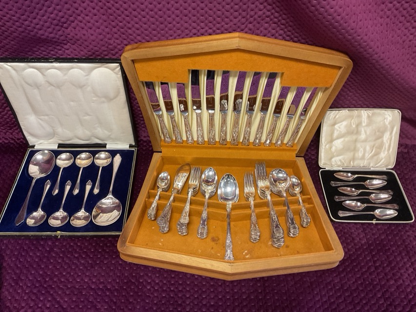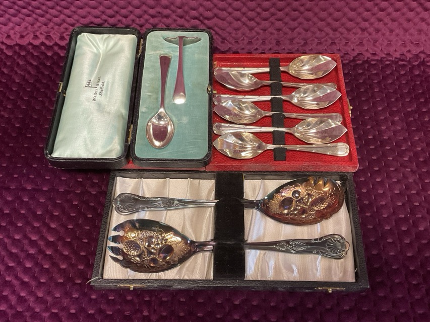 A walnut cased canteen of Queens pattern silver plated cutlery; and five other cased sets - childrens, serving sets, grapefruit spoons, dessert set, etc. (6)