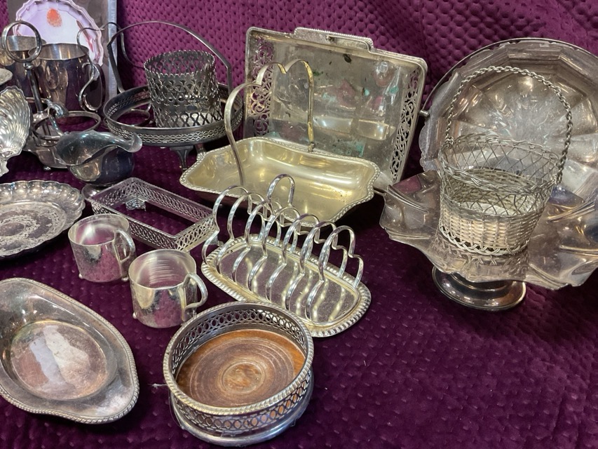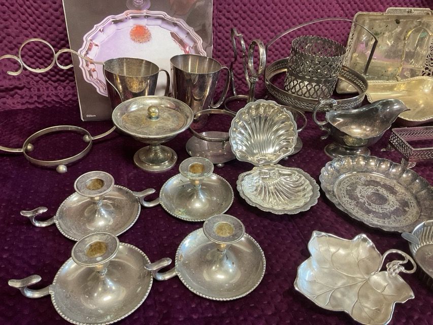 A quantity of silver plate - stands, a set of four candlesticks with beaded rims, ashtray, cake baskets, tankards, a toast rack, a gravy boat, butter dishes, salvers, coaster, etc. (A lot)