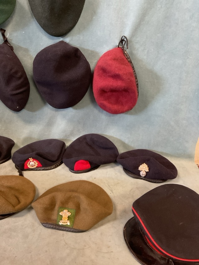 A collection of British military berets - Royal Marines, the Rifles, Royal Navy, Royal Regiment of Fusiliers, Royal Welsh, Princess of Wales Regiment, some with badges, Royal Army Service Corps, Royal Artillery officers caps, etc. (15)