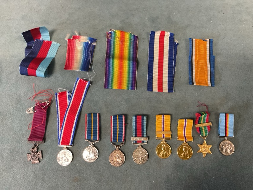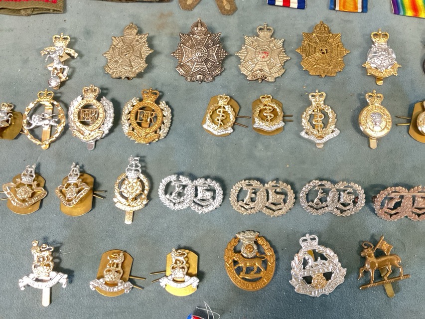 A collection of British military brass and staybright cap and beret badges - Yorkshire, Lancastrian, Borders regiments, RAMC, Royal Engineers, Lancashires and army cadet epaulets, medal ribbons and miniatures including VC, Normandy, National Service, etc. (A lot)