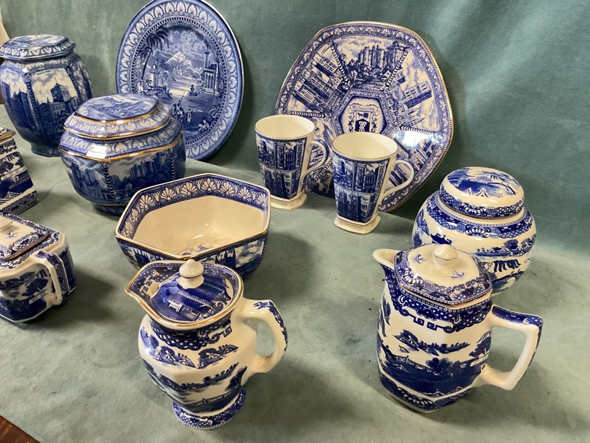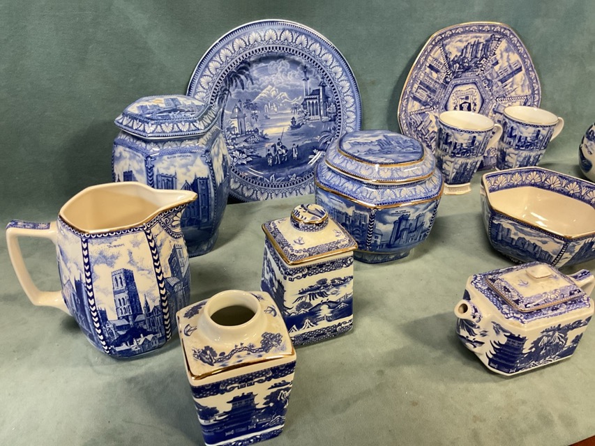 A collection of Ringtons blue & white ceramics - cathedrals tea caddy, a millennium plate & mugs, castles & cathedrals bowl, jug, biscuit barrel, ginger jar, jugs, a teapot, caddies, etc. (14)