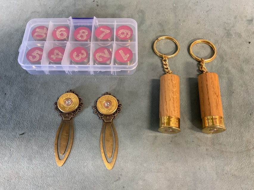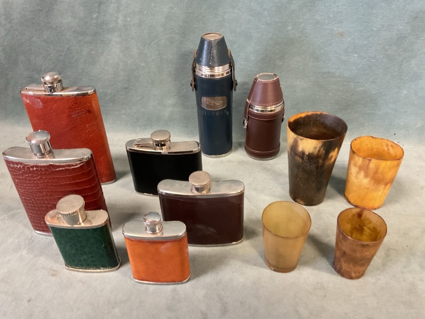 Six leather covered hip flasks, two leather bound cylindrical flasks with stacking cups, four antique horn beakers, cartridge brass key rings, brass bookmarks, and a cased set of Purdey peg selectors. (17)