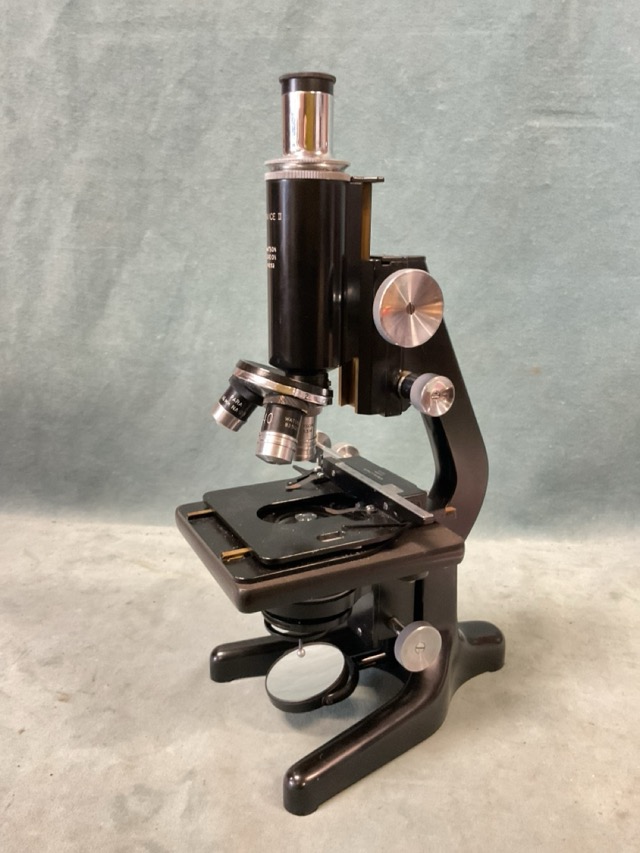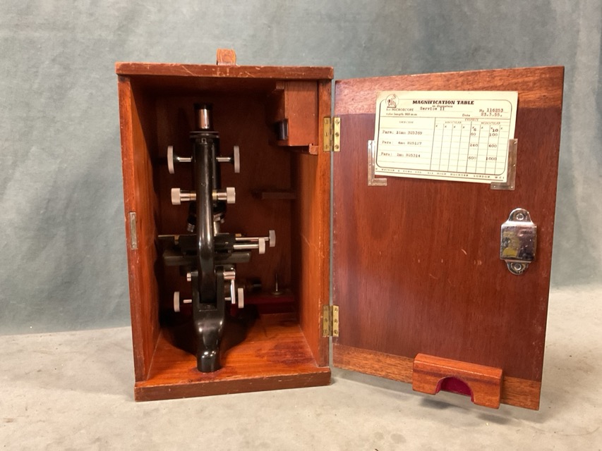 A mahogany cased Service II three-lens microscope by W Watson & Sons Ltd., serial number 116253, with 16mm, 4mm, and 2mm lenses, and a copy of the instruction manual.