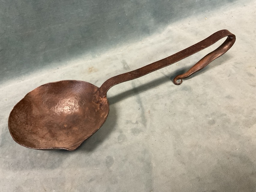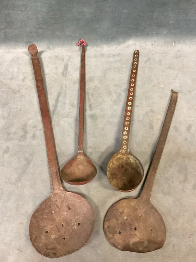 Five antique kitchen implements - a wrought iron double spouted ladle, two pierced copper skimmers, a copper ladle with tapered handle, and another with stamped floral decoration to handle. (5)