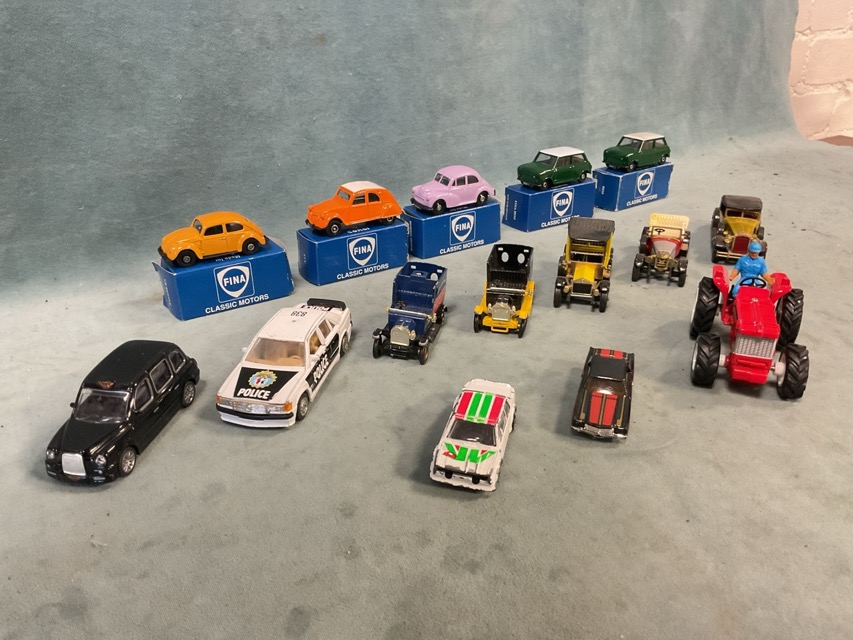 Fifteen diecast model cars - boxed Corgi Fina Classic Motors - VW Beetle, Citroën 2CV, Morris Minor, and Minis, Matchbox Models of Yesteryear, Lledo vintage delivery vans, a black cab, a tractor, a Mercedes police car, etc. (15)