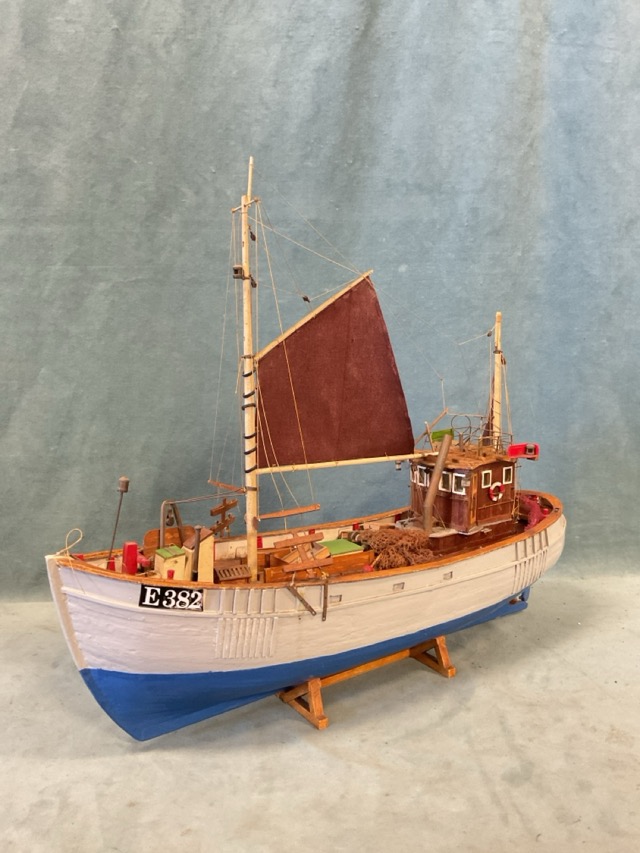 A detailed scratch-built two-masted model of a Danish North Sea fishing vessel, clinker built with wheelhouse and fully equipped deck with nets, fish boxes, etc., on a stand. (21in)