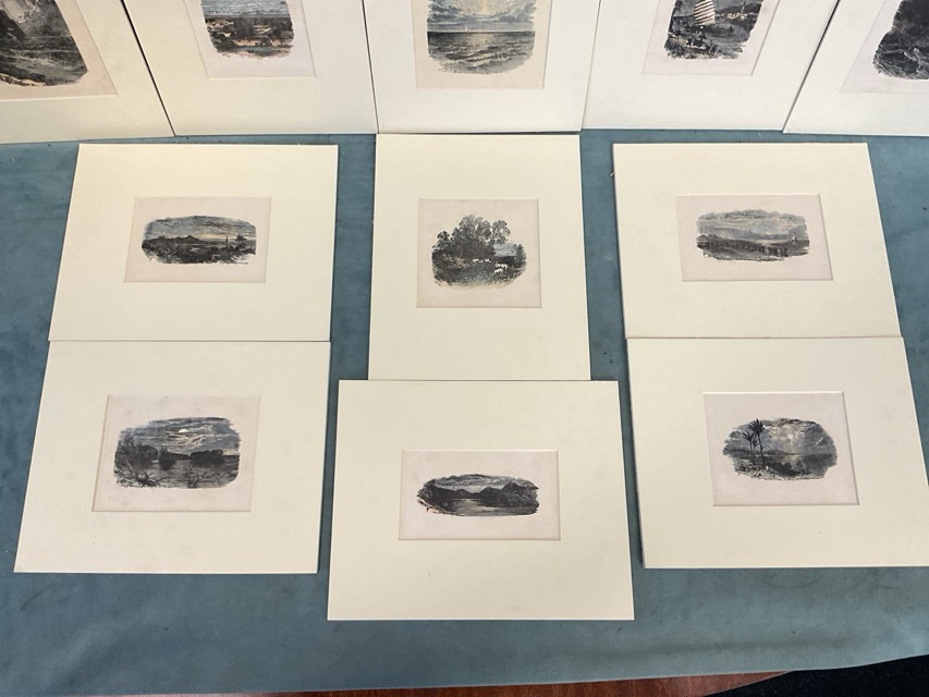 Eleven hand-tinted steel engravings after Miles Birket Foster - mainly moonlit landscapes and seascapes including Chinese and Turkish scenes, a storm at sea, lakes, a view of Eton College, fisherfolk on a beach, etc., signed or initialled in the prints, mounted. (11)