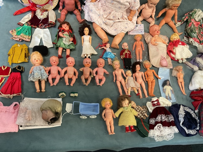 A collection of 40s, 50s and 60s dolls of various sizes, a 40s American rubber limbed cloth bodied doll by Ideal with working mama box, a doll making kit, assorted clothes, etc. (A lot)