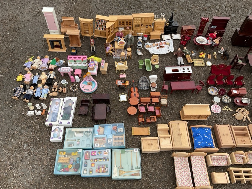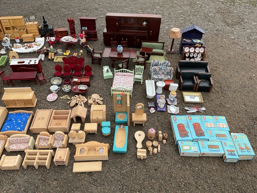 A collection of doll house furniture & dolls - parlour and dining sets, kitchens, bedrooms and bathrooms, with accessories - plates, cutlery, mirrors, books, toys, etc. (180)