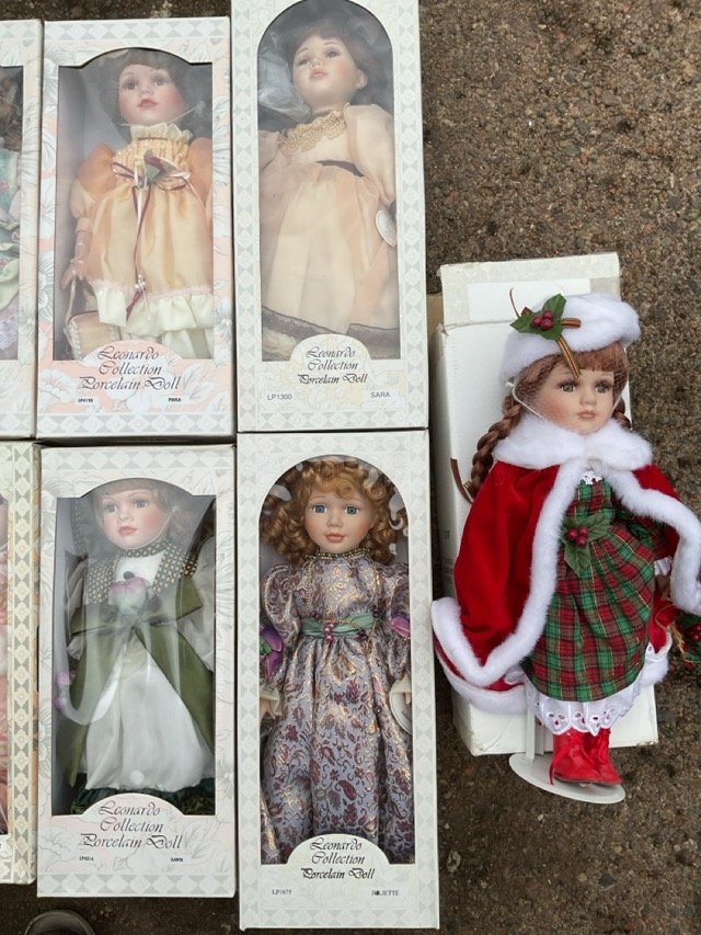 Eight boxed Leonardo Collection porcelain head collectors dolls, each differently dressed and named - Lorraine, Coral, Paula, Sara, Lorna, Connie, Dawn, Juliette; and a limited edition Holly Christmas doll. (9)