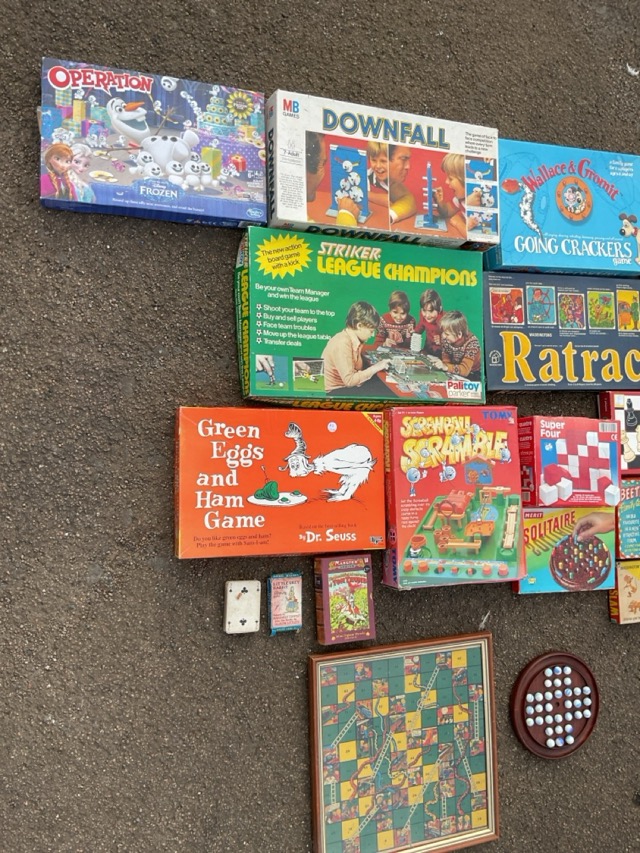 A collection of mainly boxed games - chess, solitaire, Ratrace, Beetle Drive, Tiddley Winks, Striker League Champions, Dr Seuss Green Eggs & Ham, Wallace & Gromit Going Crackers, Downfall, card games, a 40s framed Snakes & Ladders board, etc. (21)