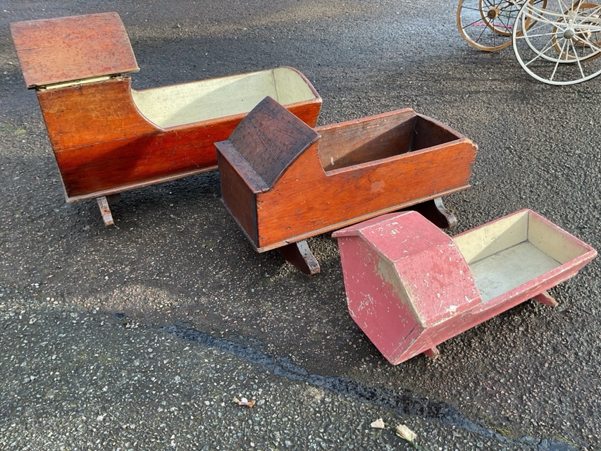 A Victorian pine cradle with scumbled decoration; another antique dolls cradle with domed canopy; and a smaller painted example. (3)