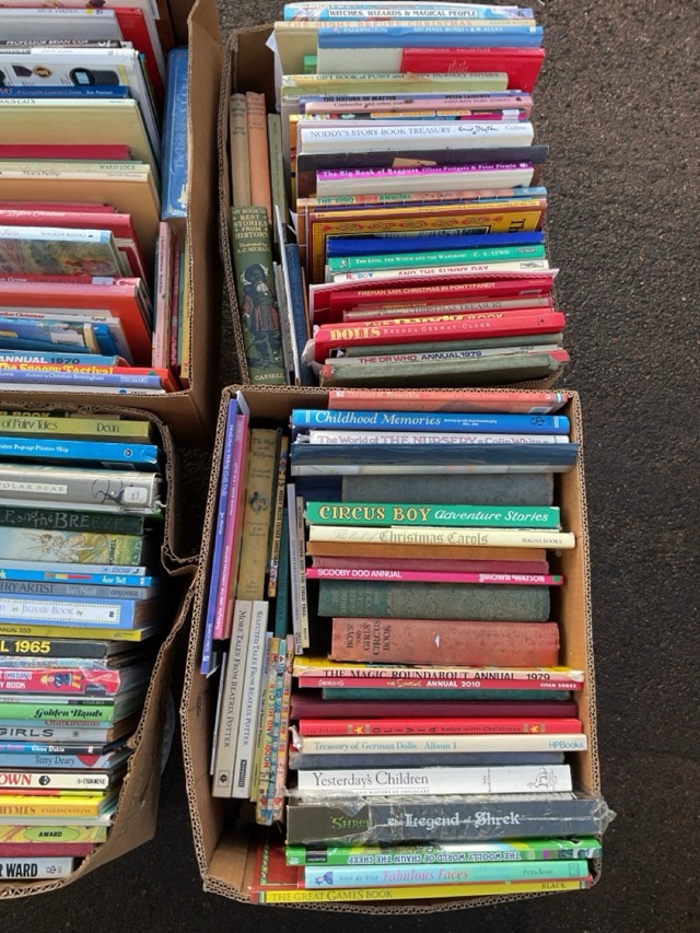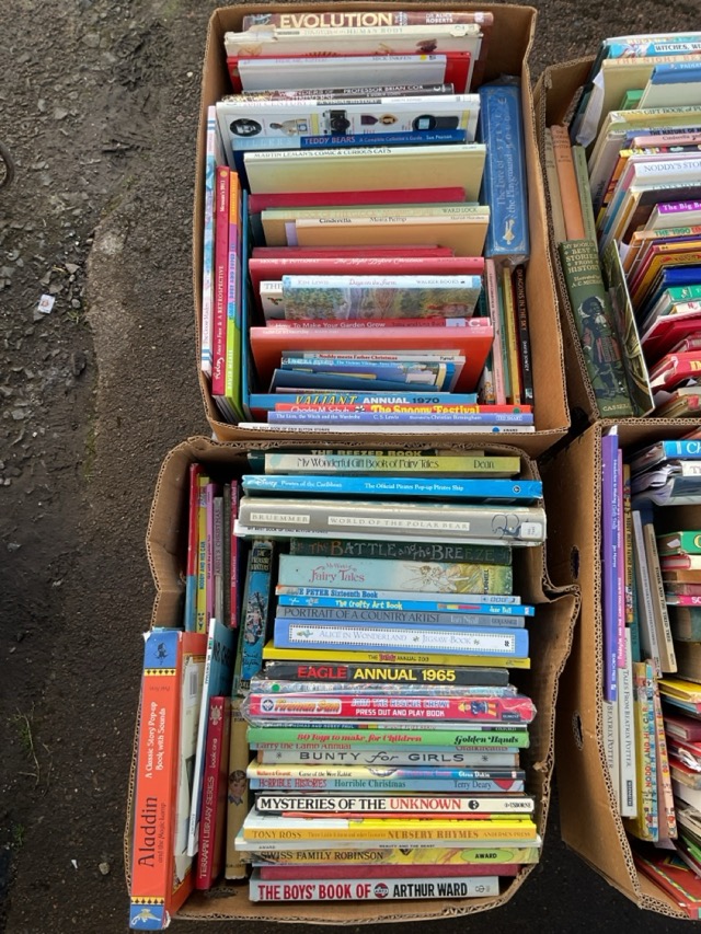 Four boxes of childrens books - fairytales, cartoons, nursery rhymes, jigsaw books, stories and novels, Beatrix Potter, Enid Blyton and E H Shepherd, etc. (approx 177)