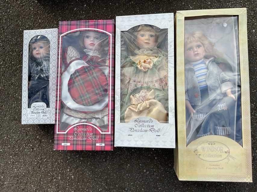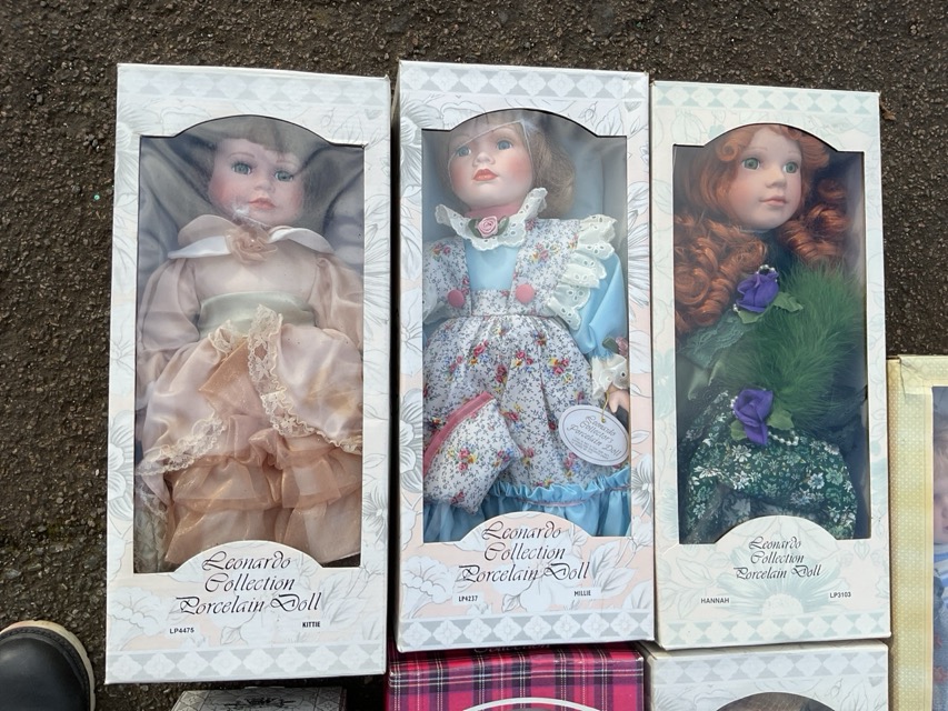 Six boxed porcelain head dolls by Leonardo dressed in Victorian style costumes - 15in Kittie, Millie, Hannah, Kate, Penny, and 12in Kittie; and another by Windsor Collection in modern dress. (7)